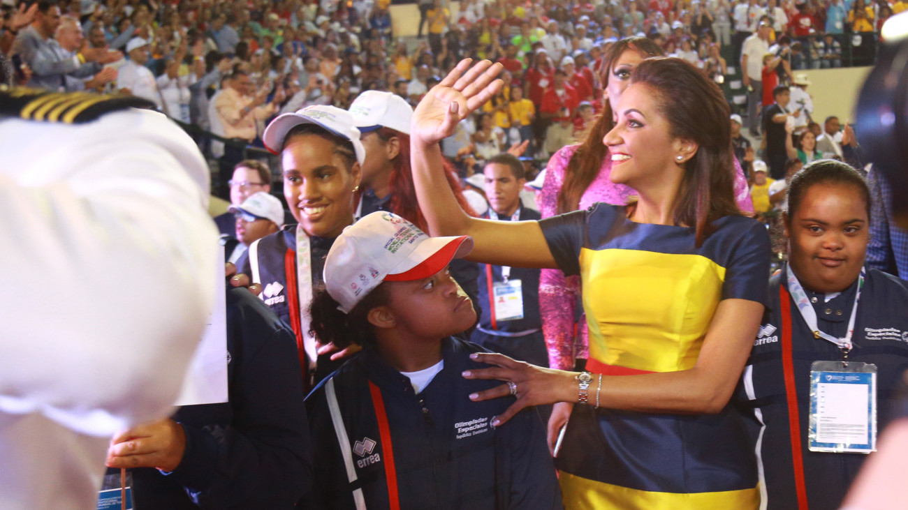 Primera Dama Candida Montilla de Medina y el Dr. Timothy Shriver Kennedy, presidente internacional de Olimpíadas Especiales y sobrino del presidente John F. Kennedy, desfilaron junto a la delegación dominicana en el acto de inauguración.
