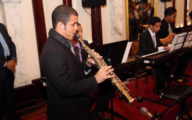 Integrantes de la agrupación musical presentada en la actividad, efectuada en el Salón Las Cariátidas, del Palacio Nacional.