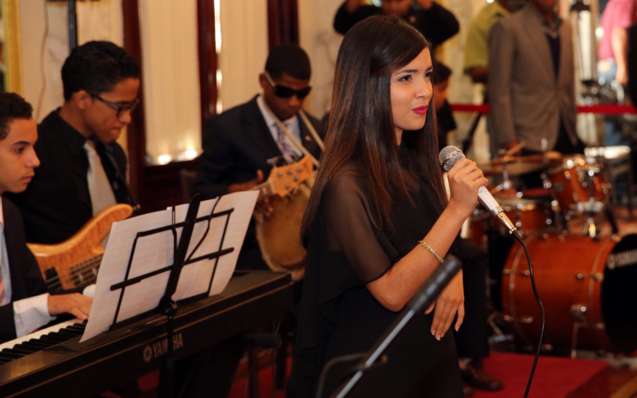 Presentación artística efectuada durante acto celebrado en el Salón de Las Cariátides del Palacio Nacional, y donde participaron cinco estudiantes dominicanos que ganaron becas de estudios en Berklee, la más prestigiosa escuela estadounidense de música, acompañaron a integrantes del Teatro Orquestal Dominicano en la interpretación de piezas, con las que amenizaron la actividad.