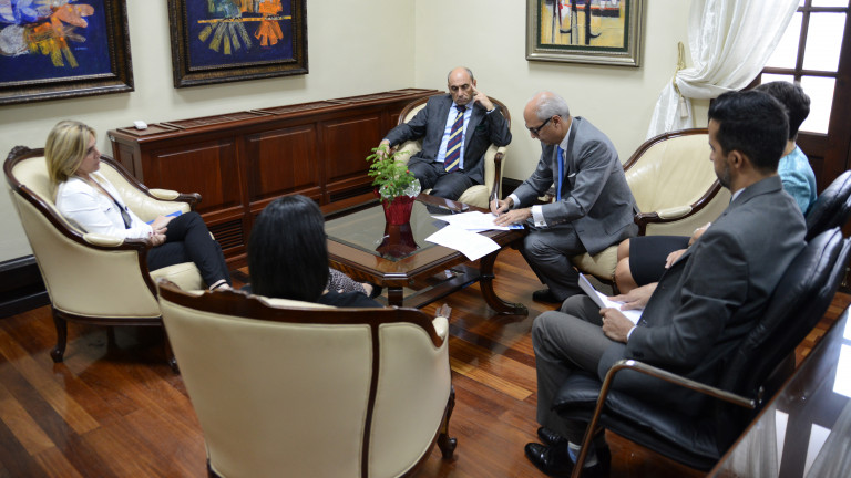 El consultor jurídico del Poder Ejecutivo, Flavio Darío Espinal, y Lorenzo Jiménez de Luis, coordinador residente del Sistema de las Naciones Unidas y representante residente del PNUD en el país, junto a delegación presente durante la firma del acuerdo.