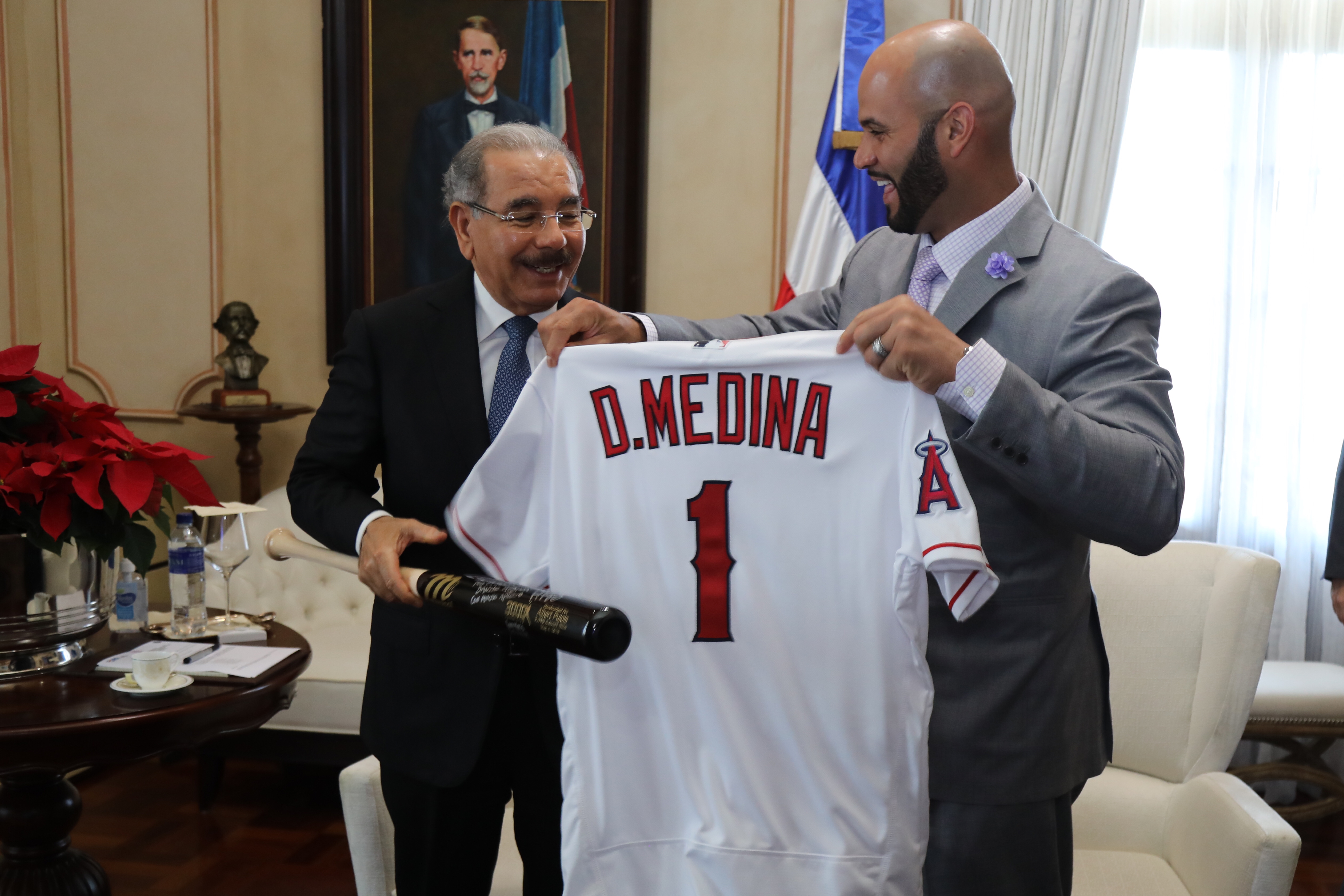 El presidente Danilo Medina con el estelar jugador de béisbol de Grandes Ligas, Albert Pujols, durante su visita de cortesía en el Salón Privado del Palacio Nacional. Foto: Luis Ruiz Tito/Presidencia República Dominicana Enlace noticia: presidencia.gob.do/noticias/presidente-danilo-medina-reci... Video YouTube: www.youtube.com/watch?v=4fHuU7duKP4