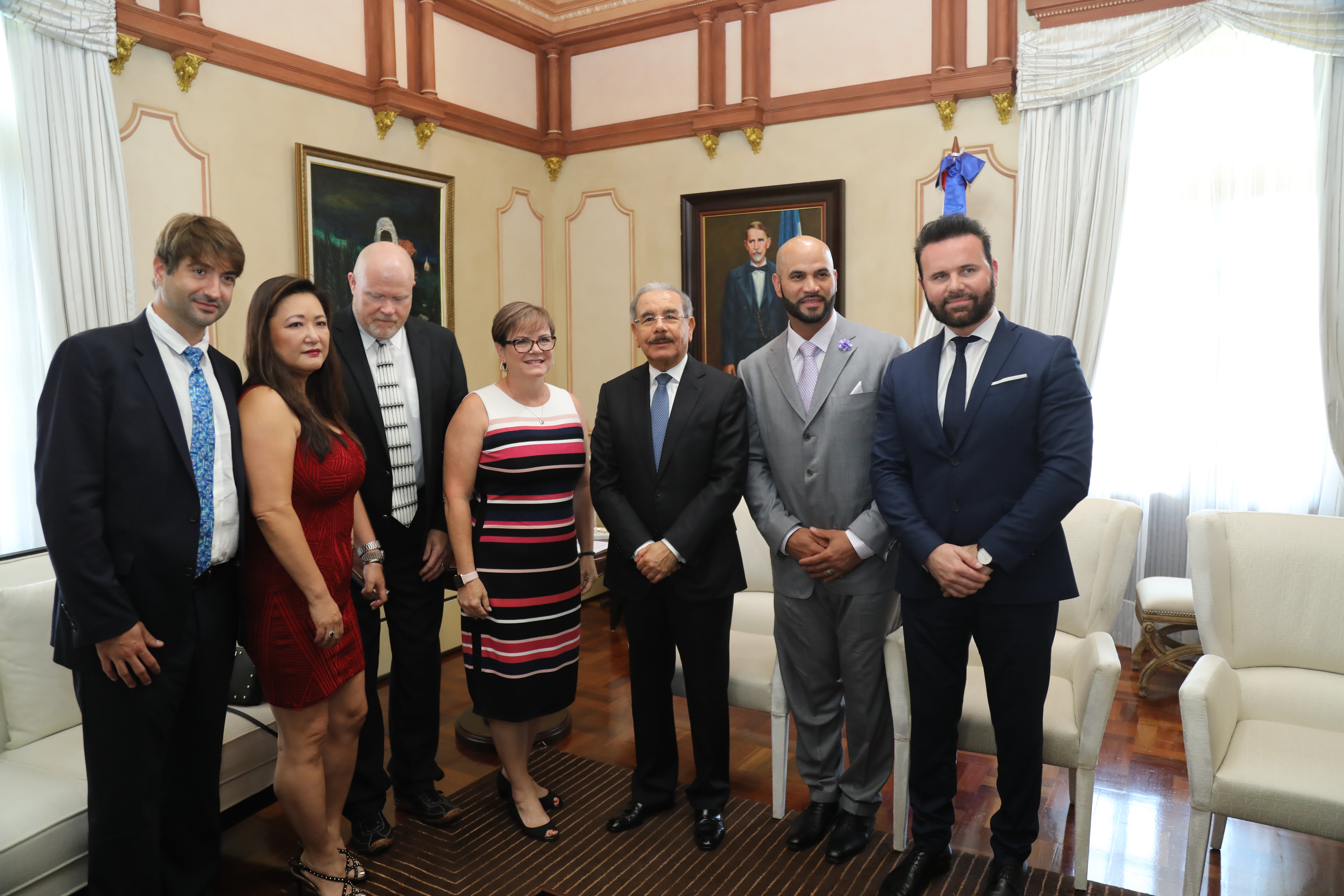 El presidente Danilo Medina acompañado del estelar jugador Albert Pujols y representantes de la organización Open Gate International, encabezados por la directora Judy Lamborn, y Christian Elliott, director de A21 International, entre otras personalidades.