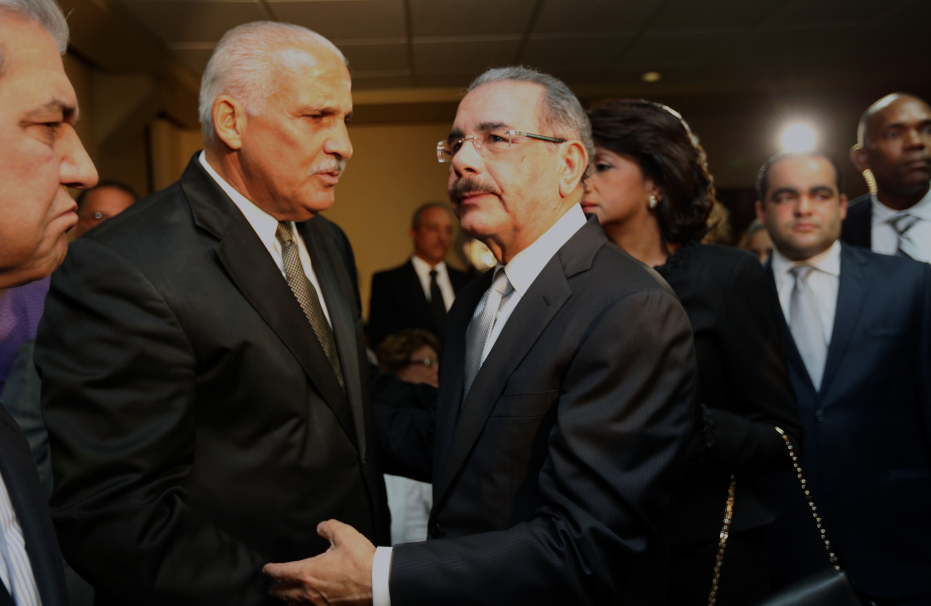 Participación del presidente Medina y su esposa Cándida Montilla de Medina, mientras ofrecen el pésame al ex vicepresidente Jaime David Fernández Mirabal por el fallecimiento de la señora Bélgica Adela (doña Dedé) Mirabal Reyes, en la Funeraria Blandino de la Av Abraham Lincoln. en esta capital.