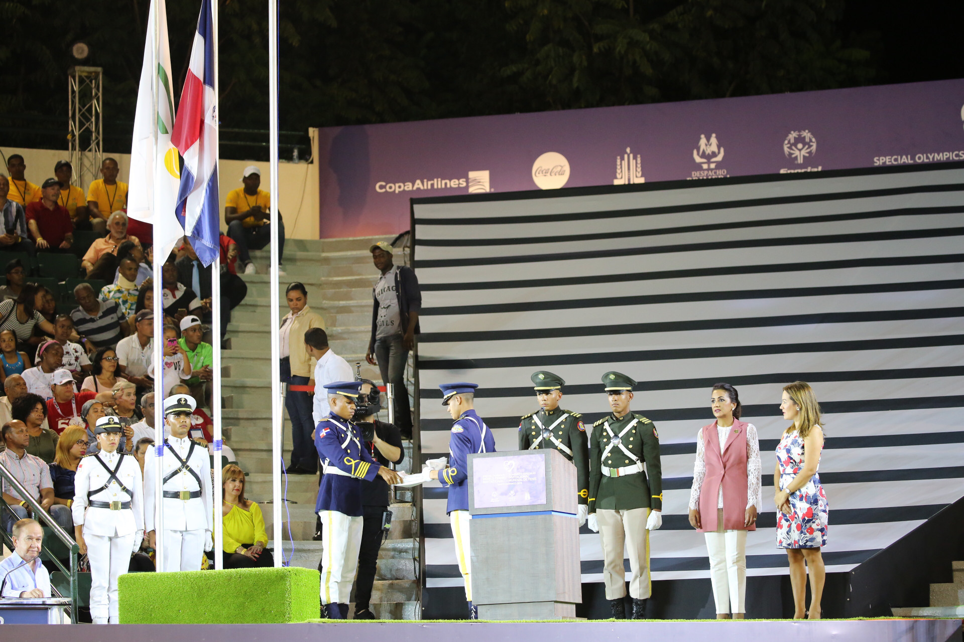 Cadetes del Ejército Nacional, la Armada Dominicana y la Fuerza Aérea, entregaron la Bandera de Olimpiadas Especiales Internacional a la primera dama de la República, Cándida Montilla de Medina,