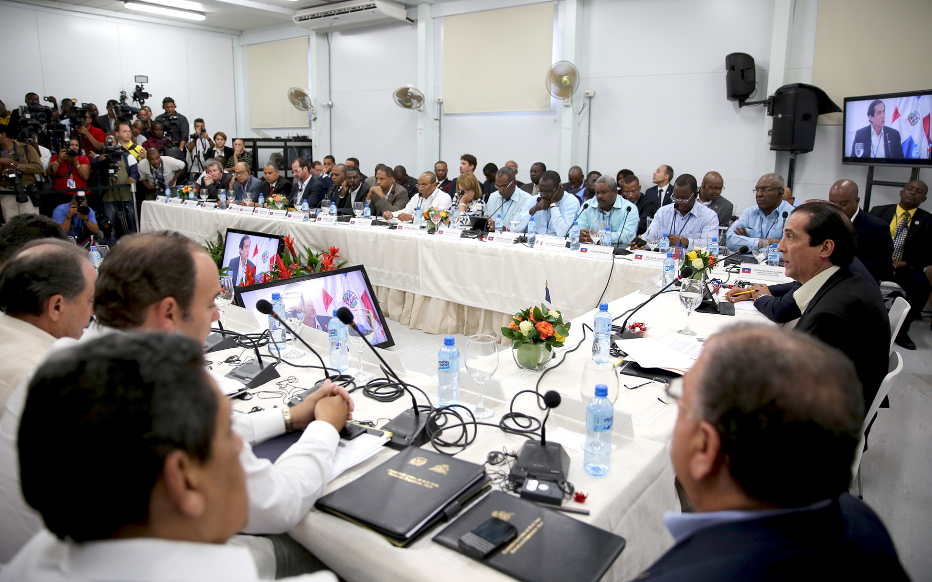 Vista de las comisiones de ambos Gobiernos presentes en la reunión. La comisión dominicana que encabeza el ministro de la Presidencia, Gustavo Montalvo; la integran los ministros de Interior y Policía, José Ramón Fadul y de Industria y Comercio, José del Castillo; el viceministro de Relaciones Exteriores, José Manuel Trullols y el Consultor del Poder Ejecutivo, César Pina Toribio.