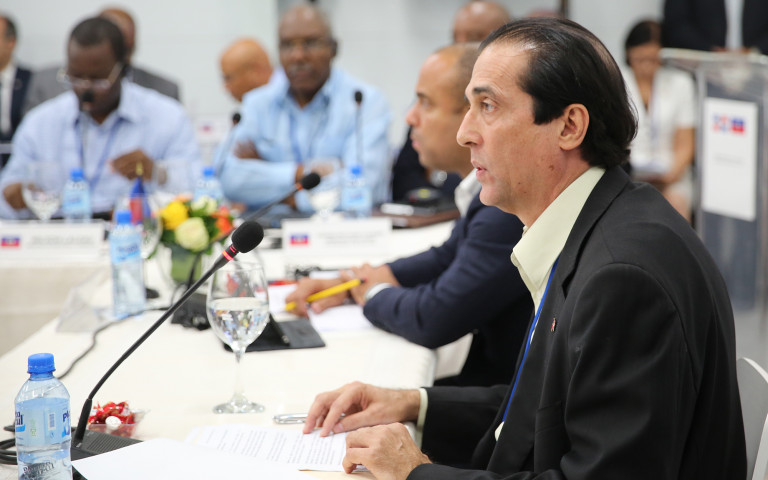 Gustavo Montalvo, ministro de la Presidencia al momento de hacer uso de la palabra, en la II Reunión de la Comisión Binacional de Alto Nivel República Dominicana - Haití, efectuada en Jimaní.