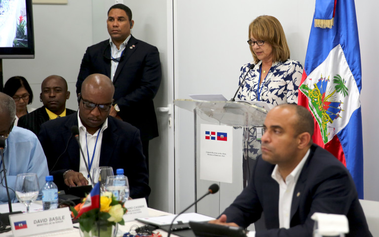 Norma Powell, presidenta de la Asociación de Industrias de Haití (AIH), mientras da la bienvenida a los presentes y agradece a los directivos del Cuerpo Especializado de Seguridad Fronteriza Terrestre (Cesfront), en Jimaní, por facilitar sus instalaciones, Se recuerda que la primera sesión del diálogo binacional República Dominicana - Haití se efectuó el pasado 7 de enero en comunidad haitiana de Juana Méndez.