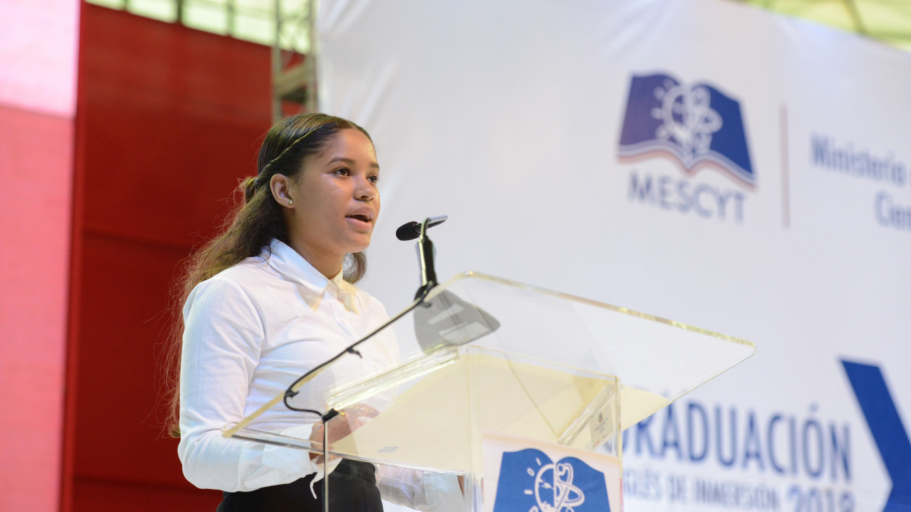 Yulenny Encarnación Vicente, recinto Urania Montás, en San Juan de la Maguana, agradeció en representación de sus compañeros, en los dos idiomas, inglés-español.