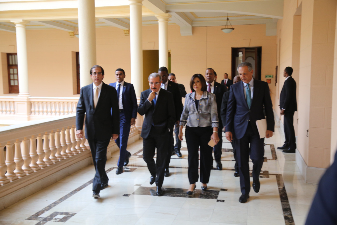 El presidente Danilo Medina, la vicepresidenta Margarita Cedeño; el ministro de la Presidencia, Gustavo Montalvo y el ministro administrativo de la Presidencia, José Ramón Peralta mientras se dirigen a la reunión.