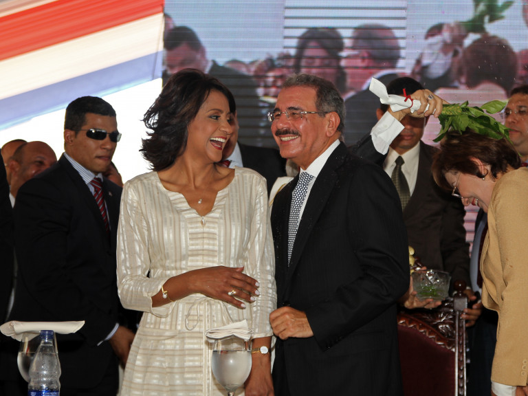 El presidente Danilo Medina y la primera dama, Candy de Medina, sonríen durante el desarrollo de la ceremonia por el inicio del año escolar.