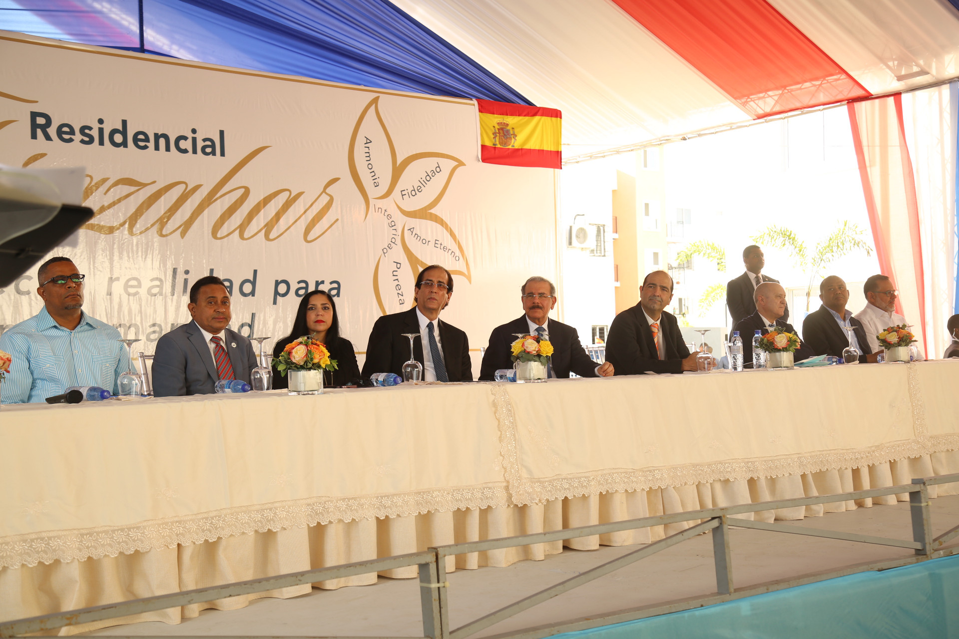 El presidente Danilo Medina, el ministro de la Presidencia, Gustavo Montalvo y ejecutivos del Consorcio Team Dominico-Español, durante la inauguración del Residencial Florazahar, en Ciudad Juan Bosch.