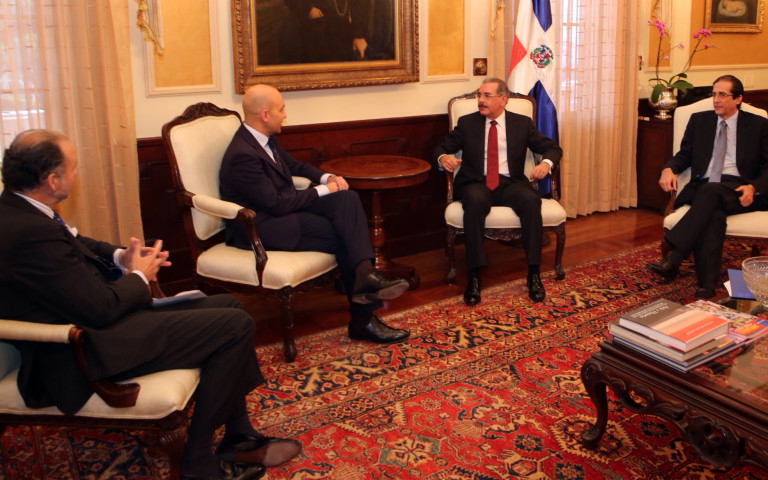 Presidente Danilo Medina Sánchez acompañado de Jaime García-Legaz, secretario de Estado de Comercio en Ministerio de Economía y Competitividad de España y el embajador de España en el país, Jaime Lacadena; el subdirector general de Comercio para Iberoamérica, Erick Rovira y la representante del Gabinete del Ministro, Beatriz Marín, presente durante el encuentro efectuado hoy en el Palacio Nacional. Figura además, el ministro de la Presidencia, Gustavo Montalvo.