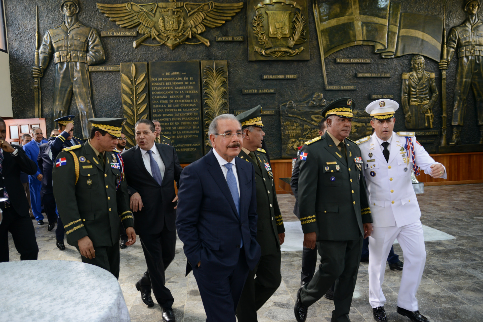 El presidente Danilo Medina junto a altos mandos militares y policiales, encabezados por el teniente general Rubén Darío Paulino Sem, ministro de Defensa, con ocasión de la Quincuagésima Séptima Promoción Ordinaria de Cadetes, de la Academia Militar Batalla de las Carreras, en San Isidro.