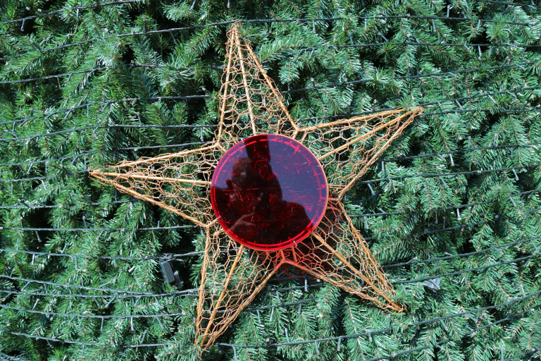 Vista de las estrellas que decoran el árbol de Navidad del Palacio Nacional elaboradas con materiales reusados.