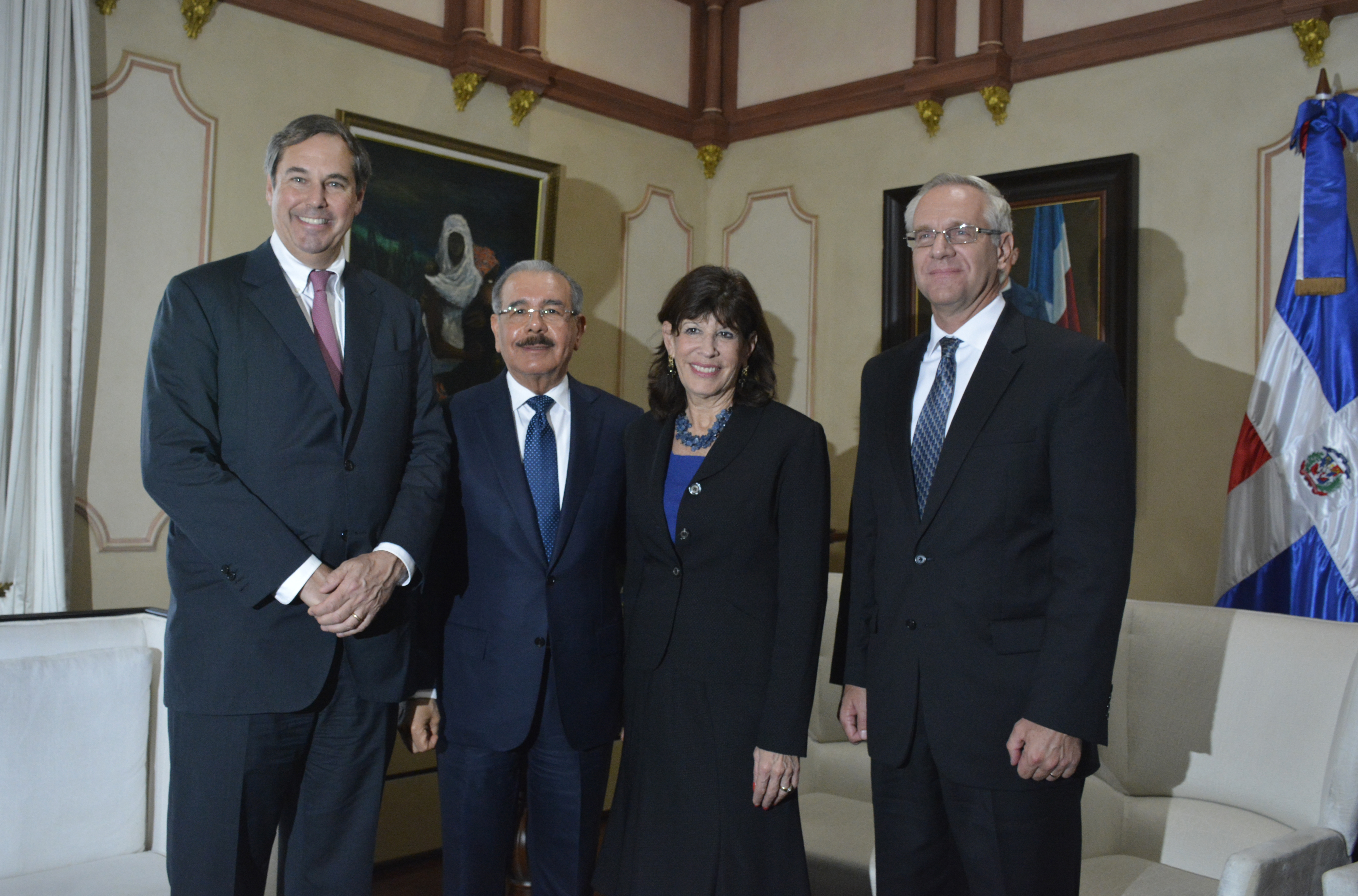 El presidente Danilo Medina con Ray W. Washburne, presidente de Overseas Private Investment Corporation (OPIC); Robin S. Bernstein, embajadora de Estados Unidos en nuestro país, y acompañante, presente en el Salón Privado del Palacio Nacional.