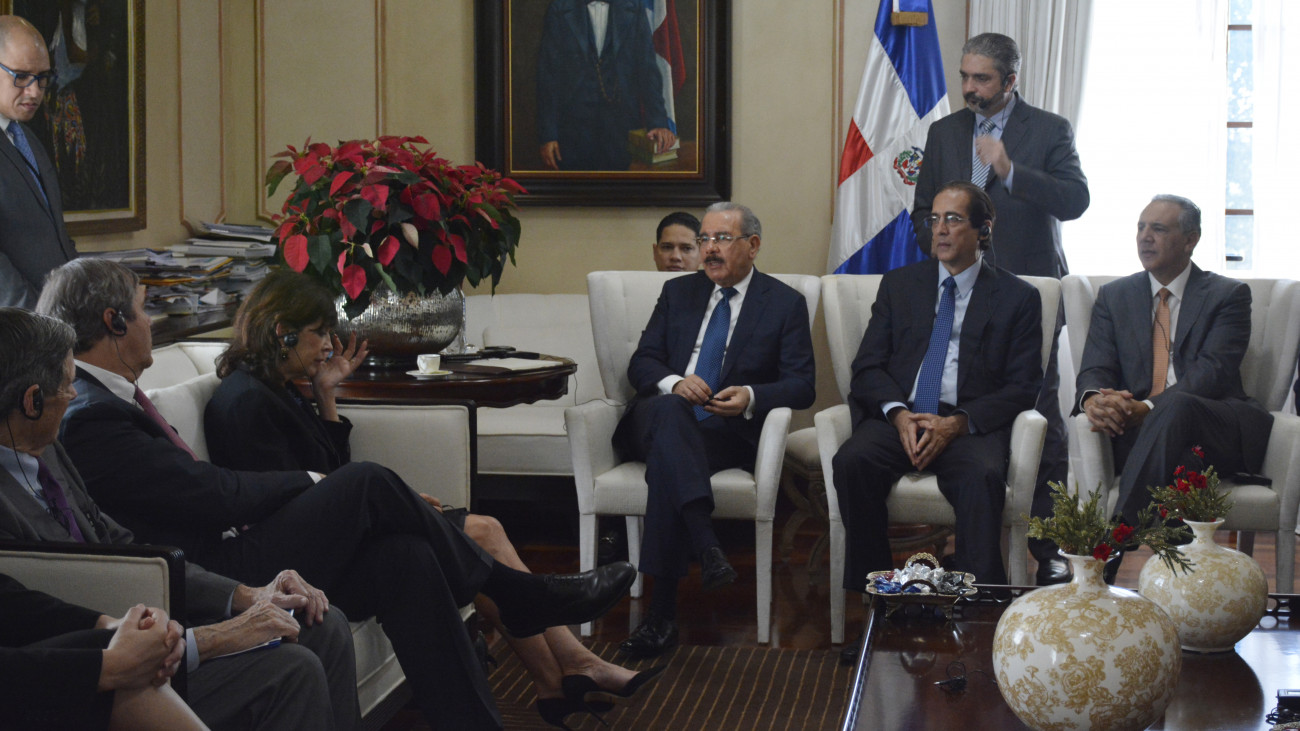Reunión de trabajo encabezada por el presidente Danilo Medina con Ray W. Washburne, presidente de Overseas Private Investment Corporation (OPIC); quien estuvo acompañado de Robin S. Bernstein, embajadora de Estados Unidos en nuestro país, y otros diplomáticos, presentes en el Salón Privado del Palacio Nacional.