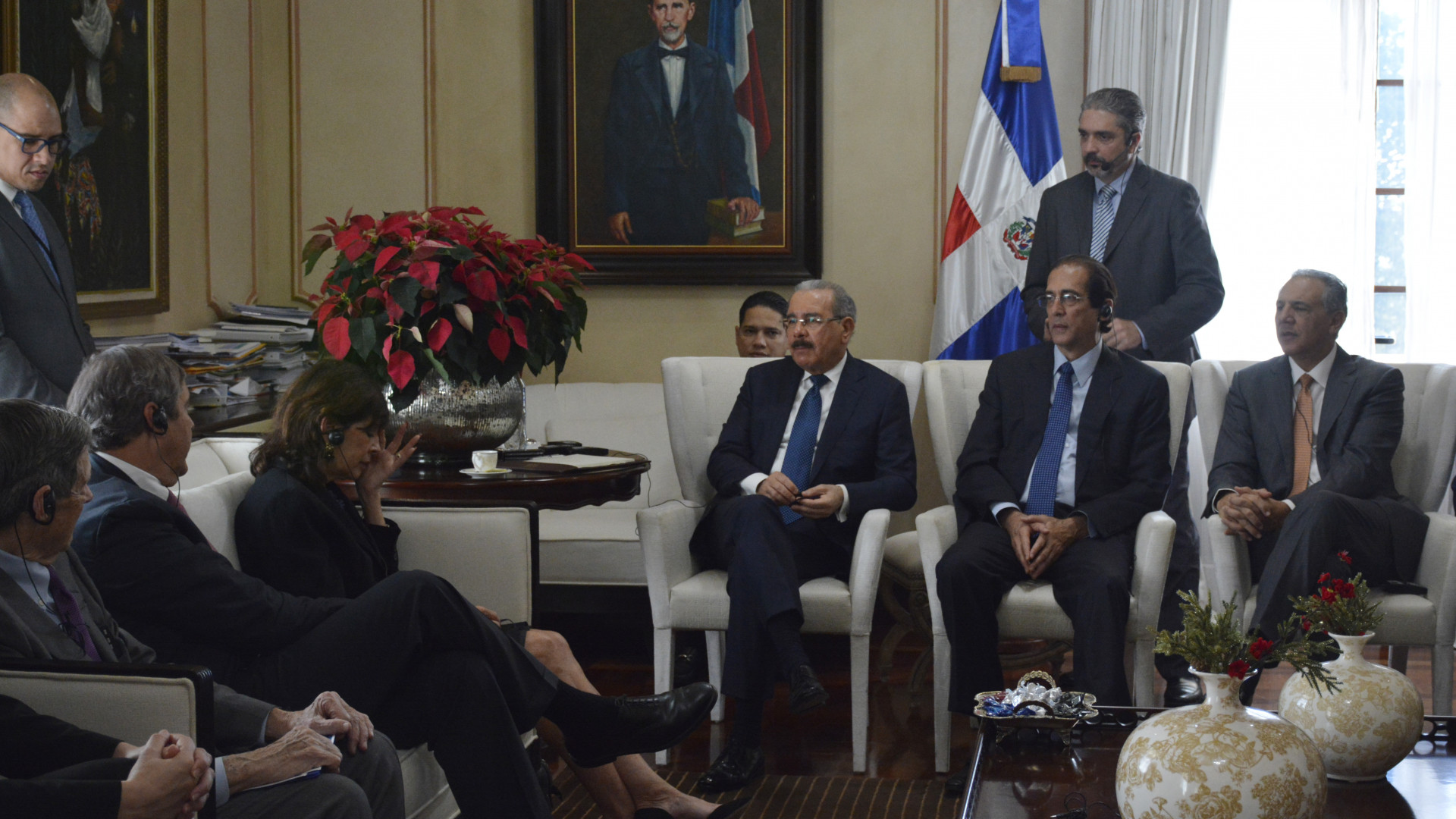 Reunión de trabajo encabezada por el presidente Danilo Medina con Ray W. Washburne, presidente de Overseas Private Investment Corporation (OPIC); quien estuvo acompañado de Robin S. Bernstein, embajadora de Estados Unidos en nuestro país, y otros diplomáticos, presentes en el Salón Privado del Palacio Nacional.