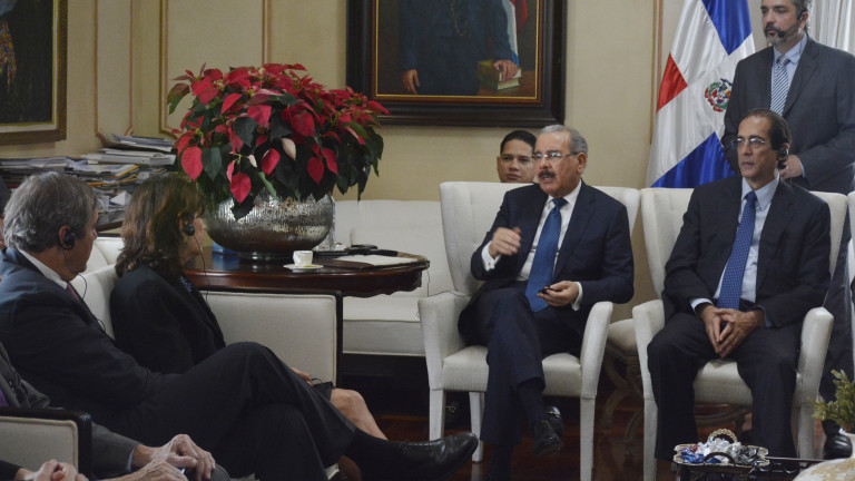 Reunión de trabajo encabezada por el presidente Danilo Medina con Ray W. Washburne, presidente de Overseas Private Investment Corporation (OPIC); quien estuvo acompañado de Robin S. Bernstein, embajadora de Estados Unidos en nuestro país, y otros diplomáticos, presentes en el Salón Privado del Palacio Nacional.