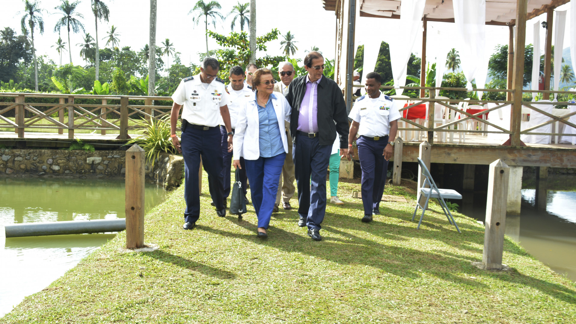 El ministro de la Presidencia, Gustavo Montalvo mientras comparte con la gobernadora de la provincia Mons. Nouel, señora Mirian Abreu; el presidente de la Unión Nacional de Bomberos, coronel Rafael Javier Bueno; el viceministro de Interior y Policía, Geovanny Tejada; y el secretario de la Unabomb, Medardo Quezada.