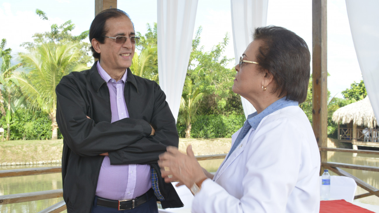 El ministro de la Presidencia, Gustavo Montalvo mientras comparte con la gobernadora de la provincia Mons. Nouel, señora Mirian Abreu; el presidente de la Unión Nacional de Bomberos, coronel Rafael Javier Bueno; el viceministro de Interior y Policía, Geovanny Tejada; y el secretario de la Unabomb, Medardo Quezada.