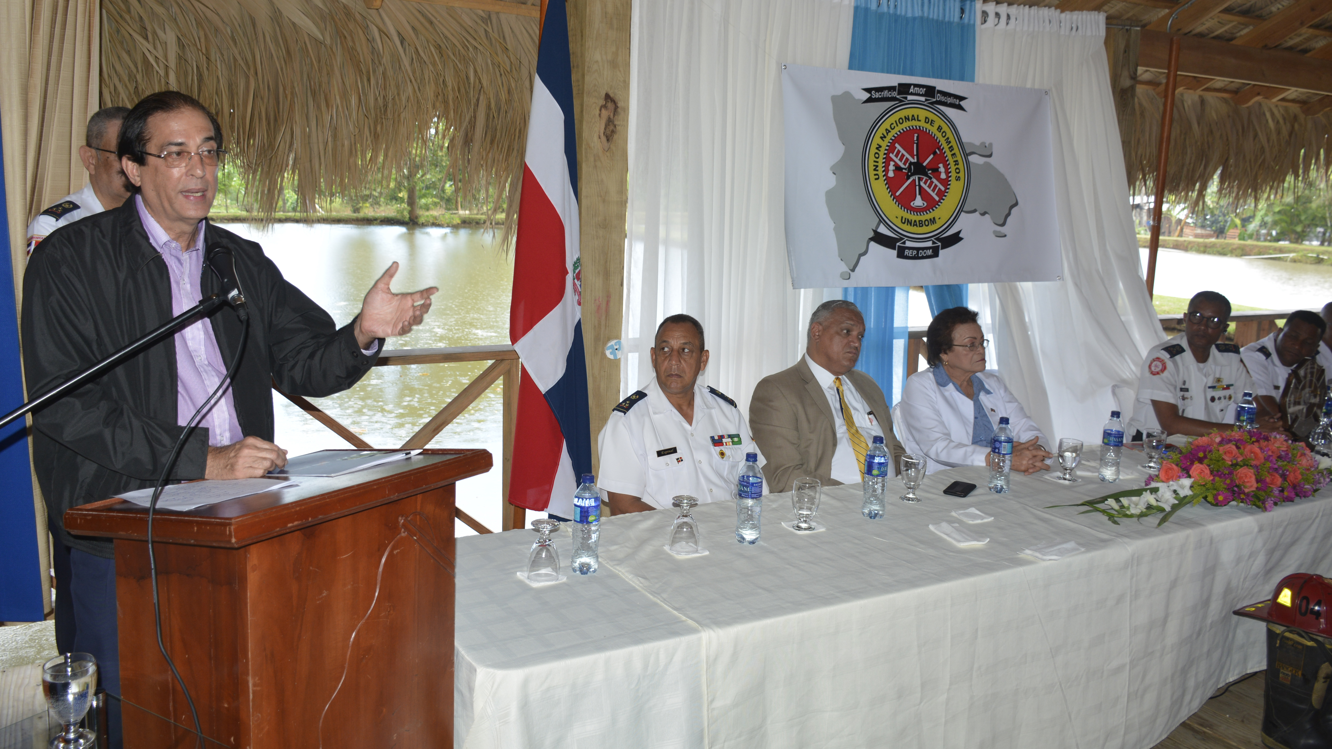 Participación del ministro de la Presidencia, Gustavo Montalvo, durante la Asamblea Ordinaria de la Unión Nacional de Bomberos (Unabomb), realizada en Bonao, donde anunció mejoras salariales y otros beneficios para esta institución.