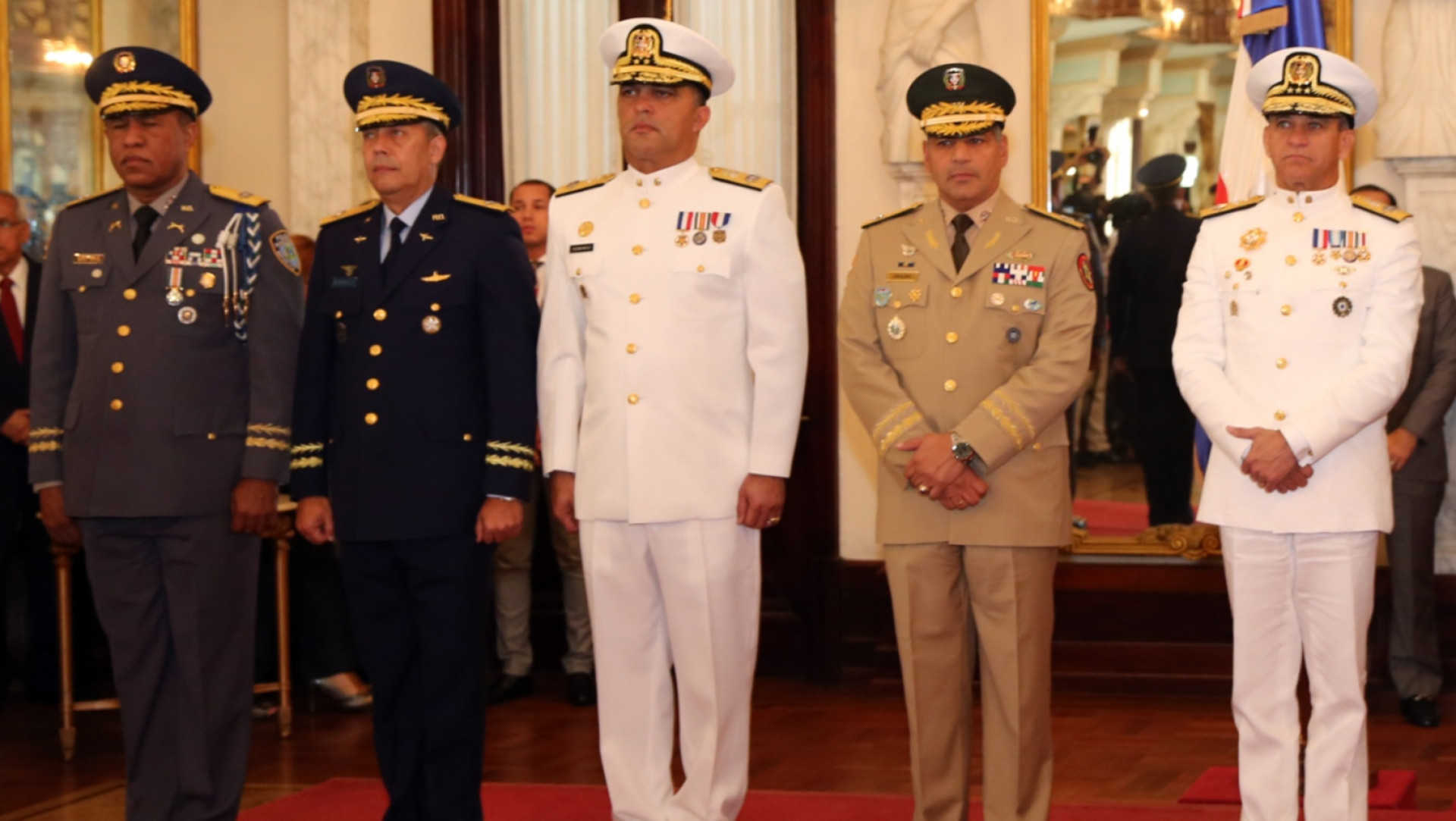 A la derecha, el ministro de Defensa, almirante Sigfrido Pared Pérez, los comandantes generales del Ejército de República Dominicana, mayor general Rubén Darío Paulino Sem; de la Armada de la República Dominicana, vicealmirante Edwin Dominici Rosario; de la Fuerza Aérea de República Dominicana, mayor general piloto Ramón M. Hernández Hernández y el jefe de la Policía Nacional, mayor general Manuel Castro Castillo, presentes durante acto oficial encabezado por el presidente de la República, Danilo Medina Sánchez, para recibir las salutaciones de 270 oficiales del Ministerio de Defensa y de la Policía Nacional, que cumplen 35, 30, 25 y 20 años sirviendo a esas instituciones, efectuado en el Salón Las Cariátides, del Palacio Nacional.