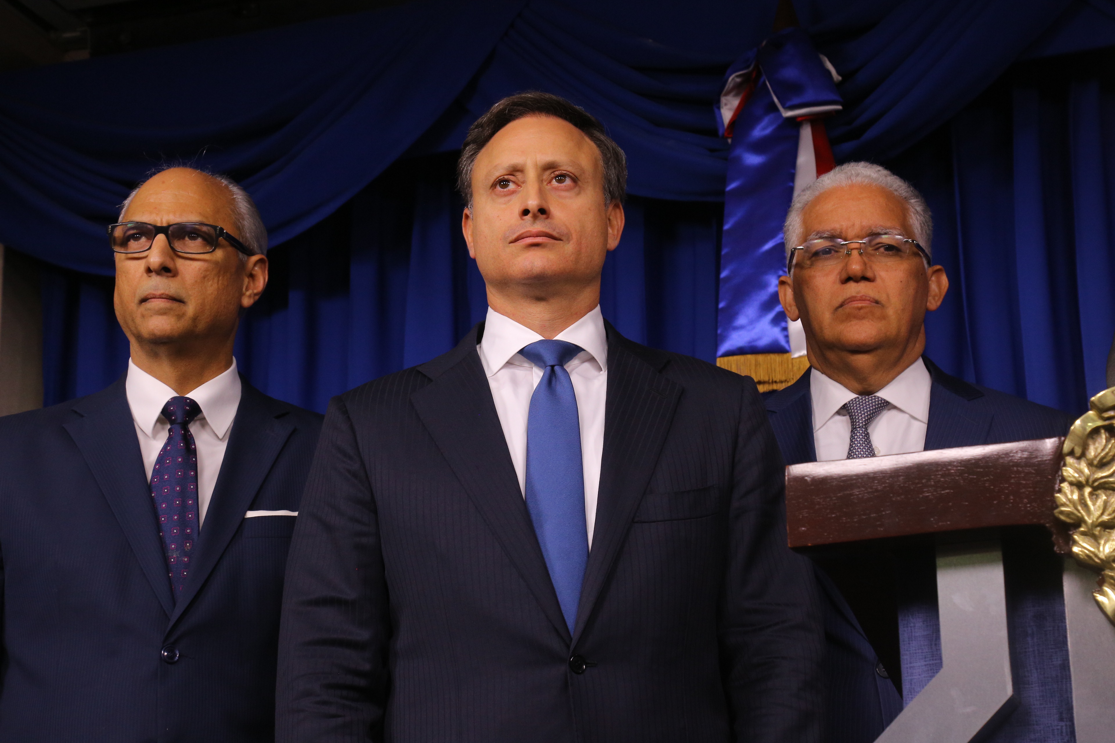 Dr. Flavio Darío Espinal, consultor jurídico del Poder Ejecutivo; Jean Alain Rodríguez, procurador general de la República, y el juez de la Suprema Corte de Justicia (SCJ) y secretario del CNM, Frank Soto, durante rueda de prensa en el Salón Orlando Martínez del Palacio Nacional.