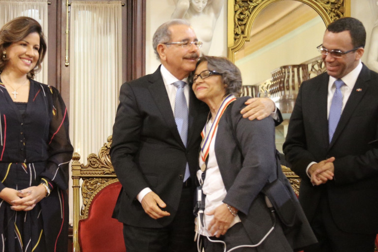 El presidente Danilo Medina felicita a la profesora Juana Isela Santos Justo, de la regional 08, Santiago, luego de recibir la Medalla al Mérito Magisterial Ercilia Pepín, categoría “Aporte al Desarrollo de la comunidad Educativa y al Trabajo Cultura.