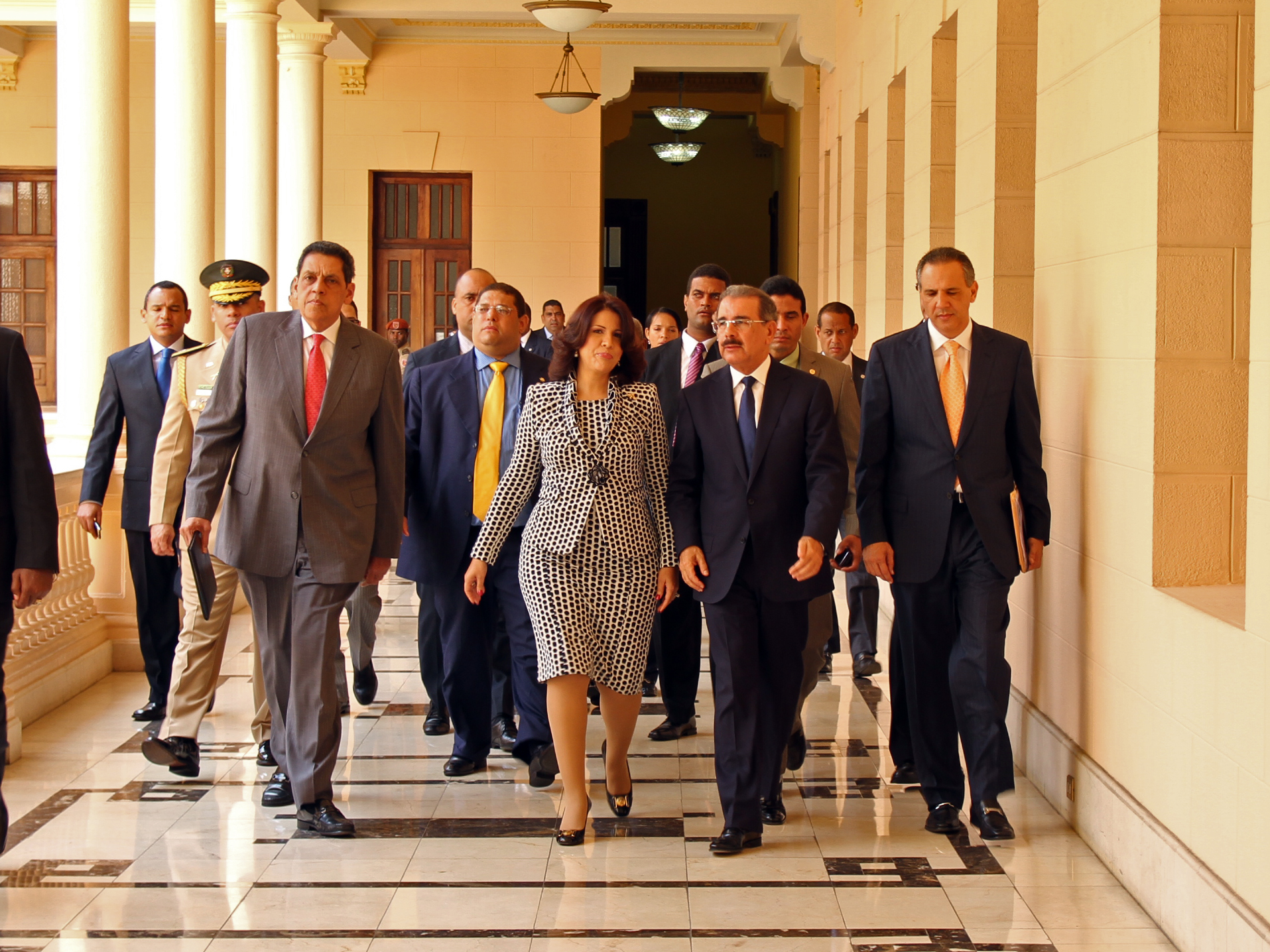 El presidente Medina junto a la vice-presidenta Margarita Cedeño de Fernández y otros altos funcionarios se dirigen al Salón de Consejo de Gobierno para el inicio de la reunión.
