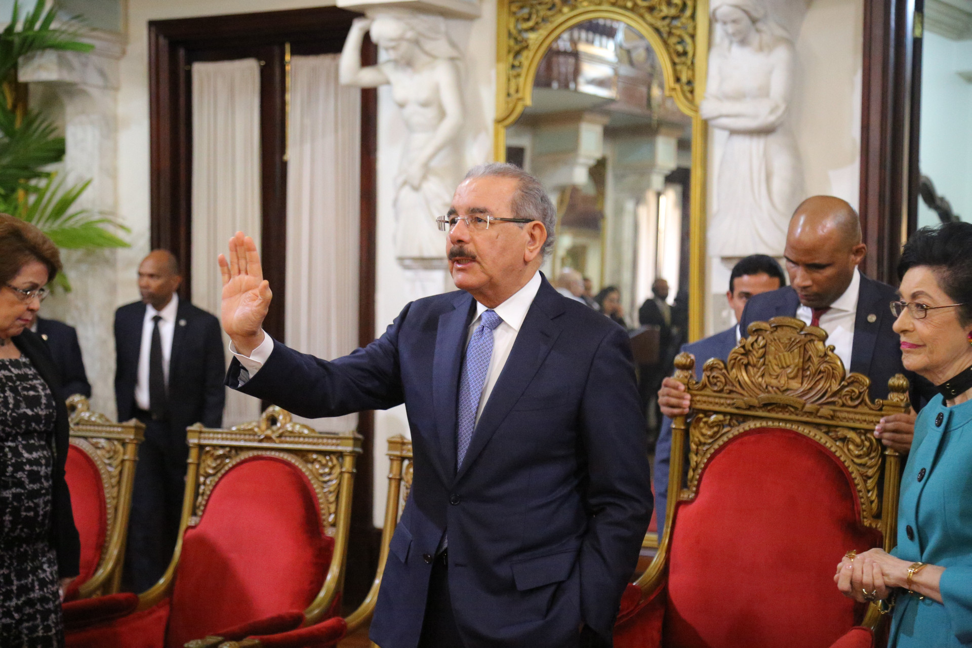 El presidente Danilo Medina saluda a los presentes a su llegada al evento celebrado en el Salón Las Cariátides del Palacio Nacional.