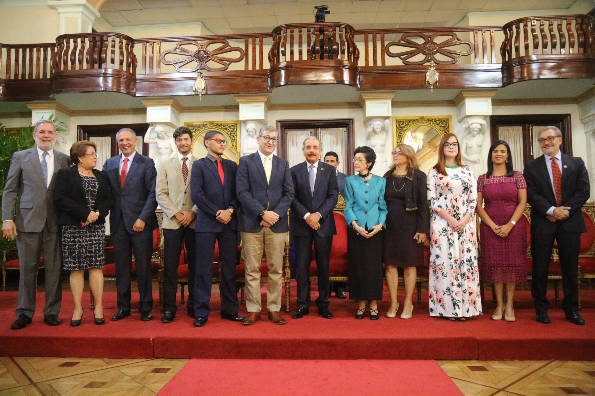 El presidente Danilo Medina junto a la señora María del Carmen Brusiloff Ugarte, Premio Nacional de Periodismo 2018, acompañada de sus familiares y funcionarios del Gobierno, presentes en el acto de reconocimiento realizado hoy en el Salón Las Cariátides del Palacio Nacional.