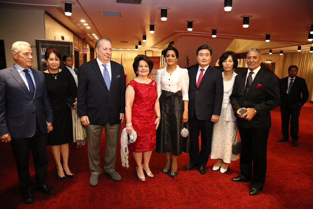 La primera dama, Cándida Montilla de Medina, junto a los ministros de Cultura, Eduardo Selman y su esposa, Gloria de Selman; de Industria, Comercio y Mipymes, Nelson Toca Simó; el director general para Asuntos Centroaméricanos y el Caribe de IYF, Jin Sung Kim, y el director del Teatro Nacional, Erasmo –Nini- Caffaro, entre otras personalidades.