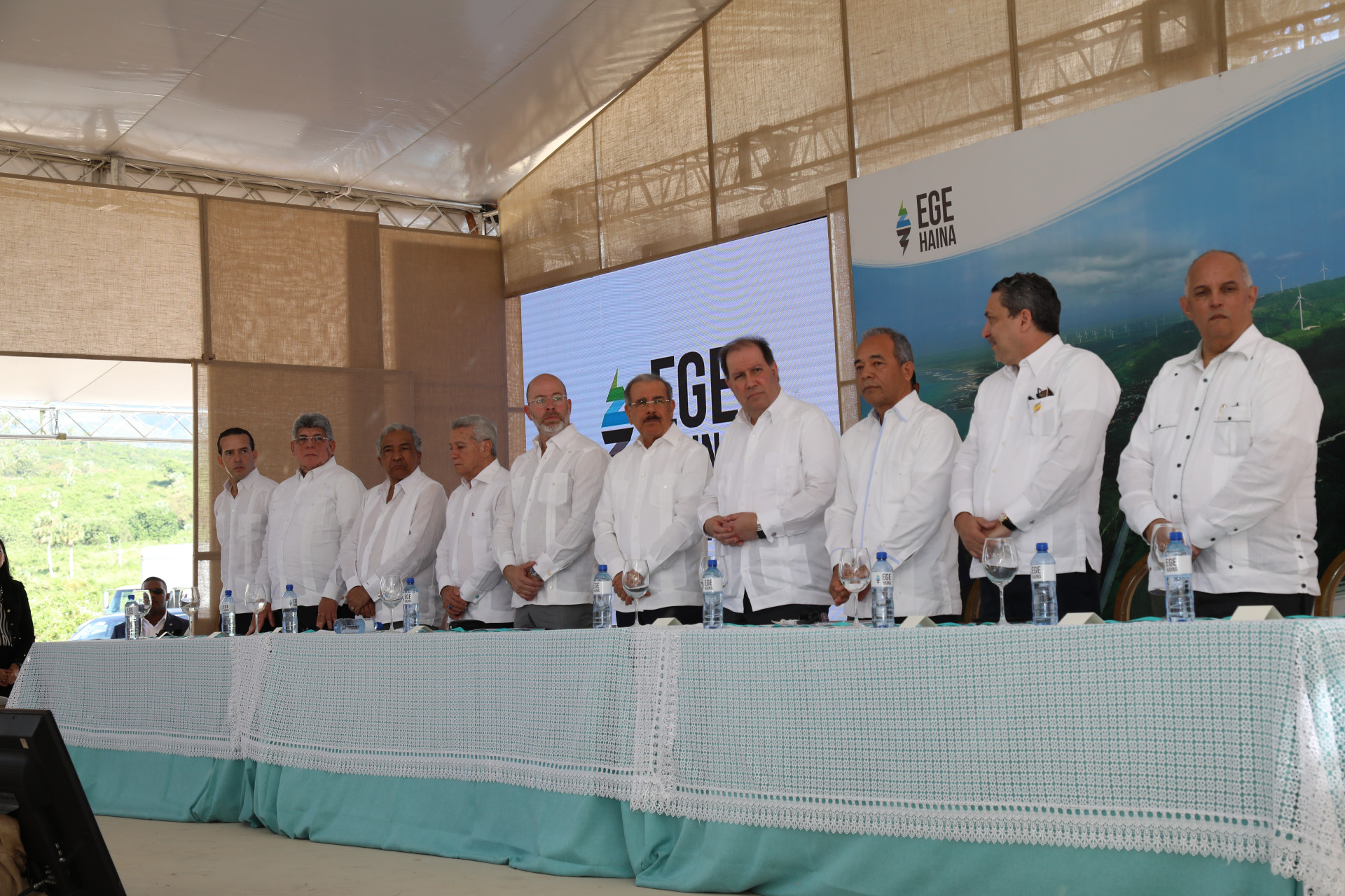 Durante el acto, el presidente de la República estuvo acompañado de Felipe Vicini, presidente de VICINI; Nelson Toca Simó, ministro de Industria y Comercio y Mipymes; César Prieto, superintendente de Electricidad; Rubén Jiménez Bichara, vicepresidente ejecutivo de la CDEEE; Luis Mejía Brache, gerente general de EGE-Haina; Ángel Canó, director ejecutivo de la Comisión Nacional de Energía; Rafael Vélez, presidente del Consejo de Administración de EGE-Haina, y Roberto Rodríguez Marchena, portavoz del Gobierno y director general DICOM,