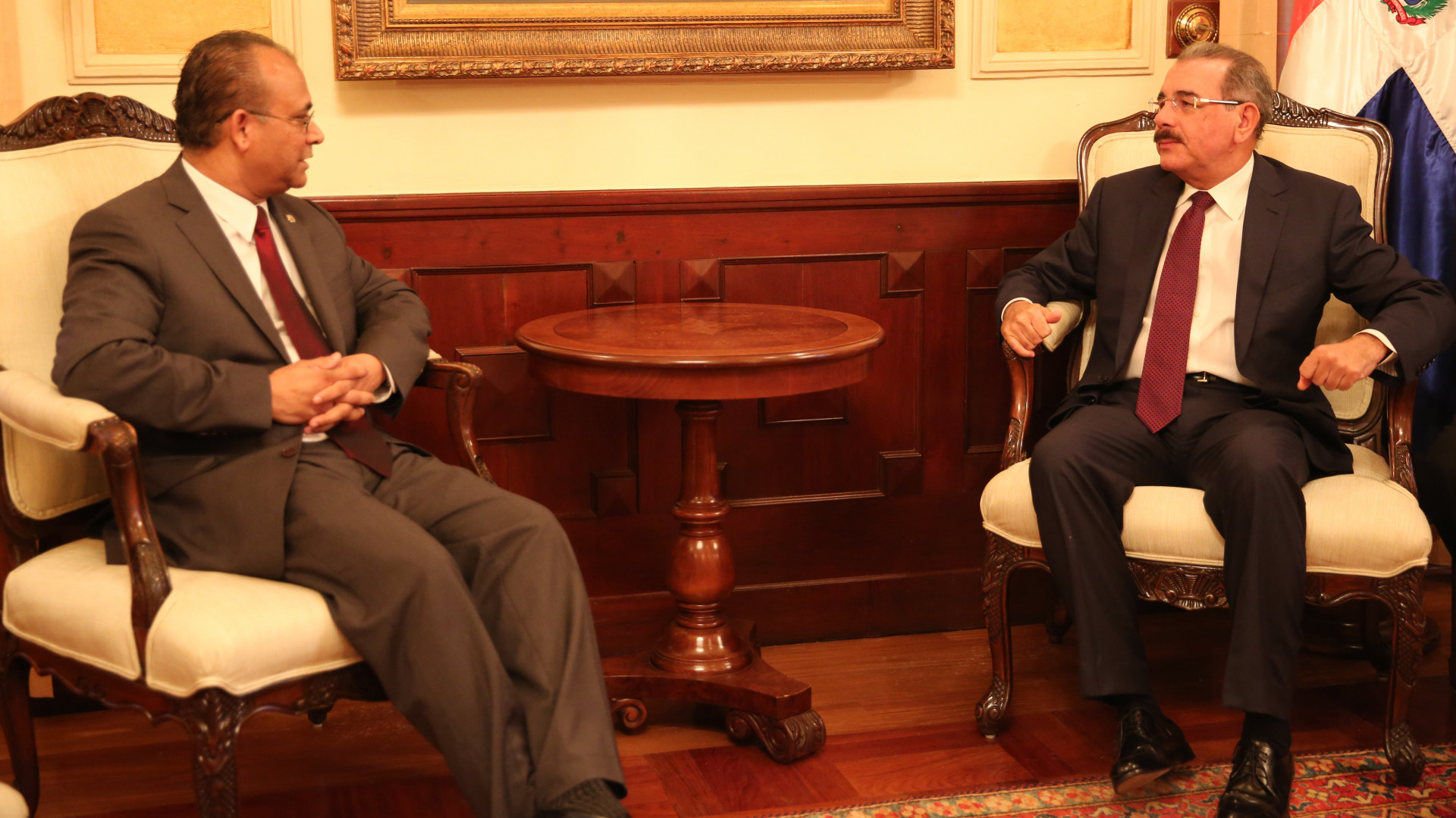 El presidente Medina al momento de recibir la visita del secretario general adjunto de la OEA Ramdin, quien le manifestó el interés del organismo multilateral en tener un representante en el próximo encuentro bilateral República Dominicana-Haití, que se llevará a cabo el próximo mes de marzo, a fin de contribuir a mejorar las relaciones entre estos países caribeños.