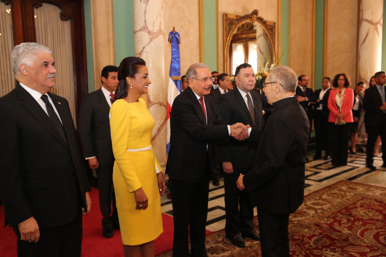 De manera entusiasta y con evidente alegría, el presidente Danilo Medina y la primera dama de la República, Cándida Montilla de Medina, recibieron los saludos de Año Nuevo, en una ceremonia que tuvo lugar en el Salón de Embajadores del Palacio Nacional.