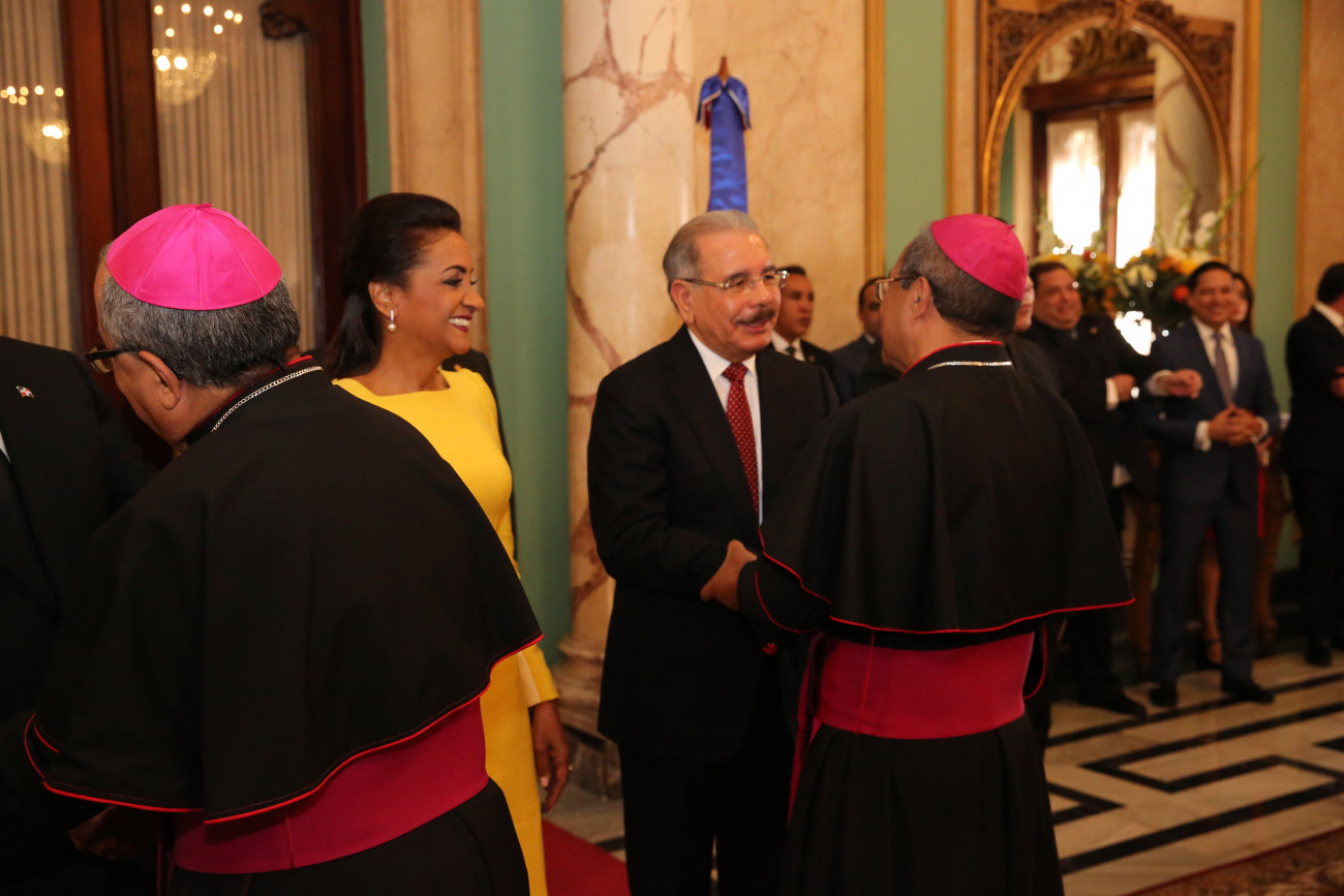 De manera entusiasta y con evidente alegría, el presidente Danilo Medina y la primera dama de la República, Cándida Montilla de Medina, recibieron los saludos de Año Nuevo, en una ceremonia que tuvo lugar en el Salón de Embajadores del Palacio Nacional.