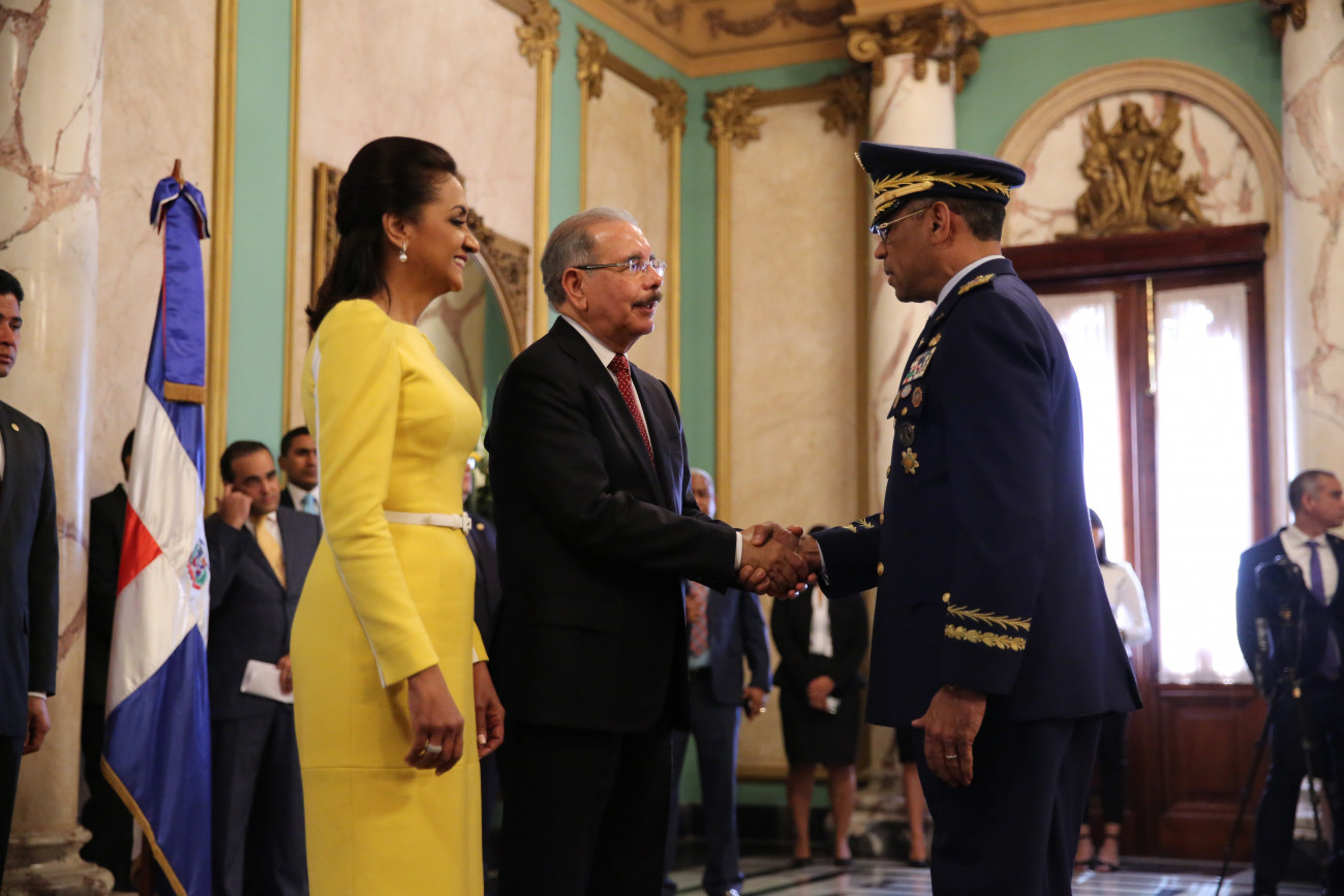 De manera entusiasta y con evidente alegría, el presidente Danilo Medina y la primera dama de la República, Cándida Montilla de Medina, recibieron los saludos de Año Nuevo, en una ceremonia que tuvo lugar en el Salón de Embajadores del Palacio Nacional.