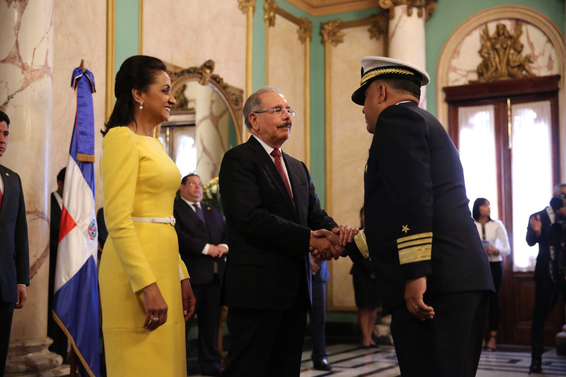 De manera entusiasta y con evidente alegría, el presidente Danilo Medina y la primera dama de la República, Cándida Montilla de Medina, recibieron los saludos de Año Nuevo, en una ceremonia que tuvo lugar en el Salón de Embajadores del Palacio Nacional.