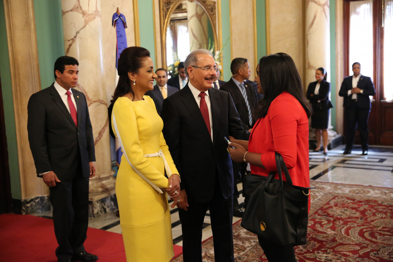 De manera entusiasta y con evidente alegría, el presidente Danilo Medina y la primera dama de la República, Cándida Montilla de Medina, recibieron los saludos de Año Nuevo, en una ceremonia que tuvo lugar en el Salón de Embajadores del Palacio Nacional.