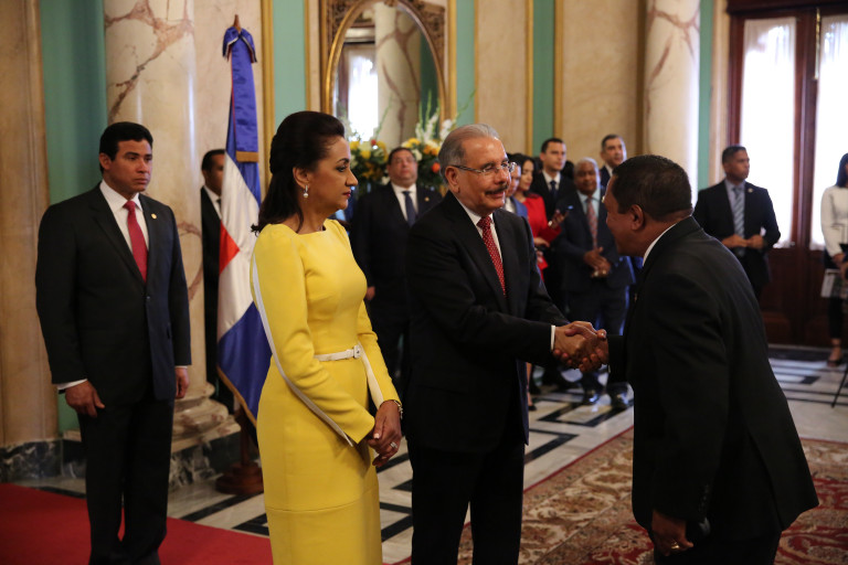 De manera entusiasta y con evidente alegría, el presidente Danilo Medina y la primera dama de la República, Cándida Montilla de Medina, recibieron los saludos de Año Nuevo, en una ceremonia que tuvo lugar en el Salón de Embajadores del Palacio Nacional.