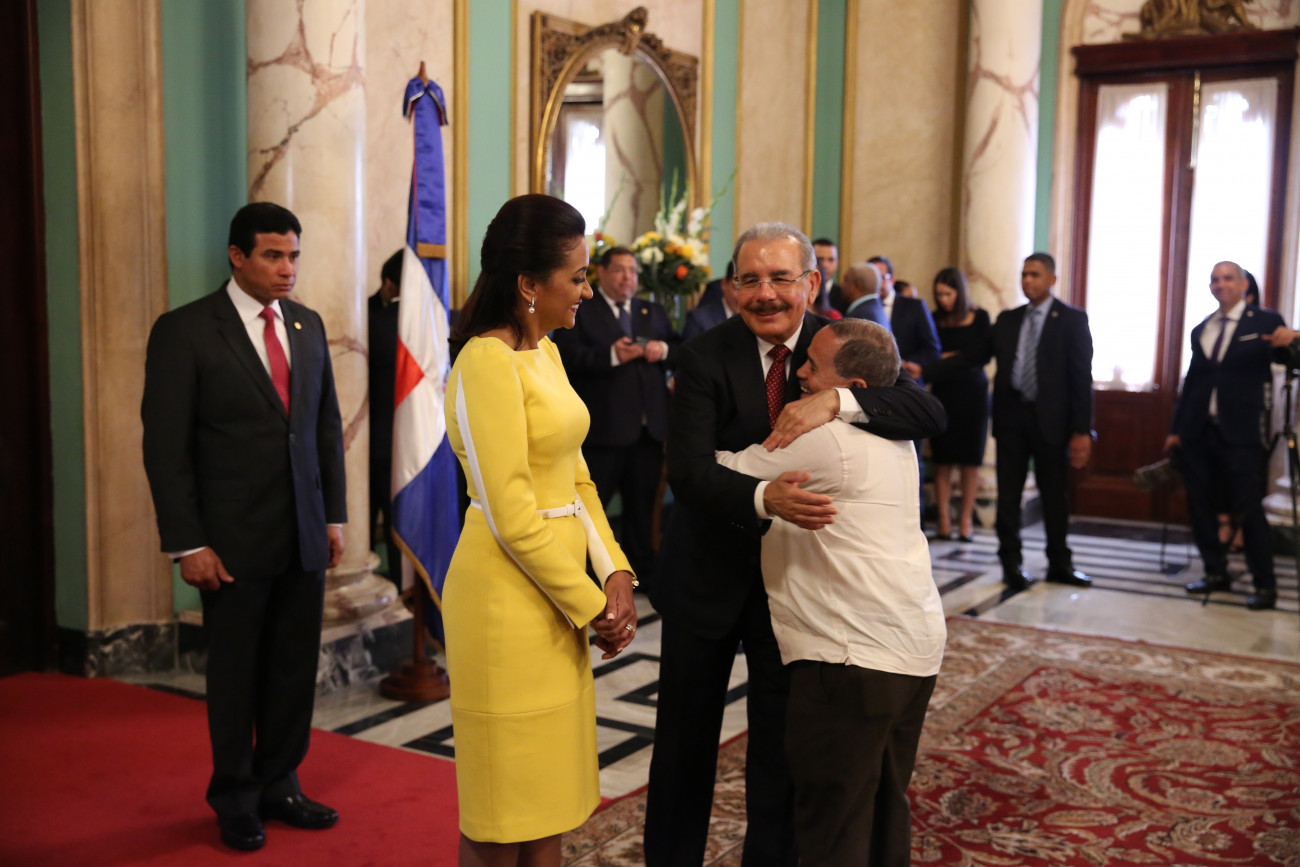 De manera entusiasta y con evidente alegría, el presidente Danilo Medina y la primera dama de la República, Cándida Montilla de Medina, recibieron los saludos de Año Nuevo, en una ceremonia que tuvo lugar en el Salón de Embajadores del Palacio Nacional.