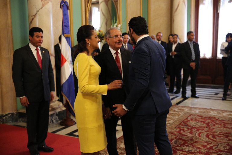 De manera entusiasta y con evidente alegría, el presidente Danilo Medina y la primera dama de la República, Cándida Montilla de Medina, recibieron los saludos de Año Nuevo, en una ceremonia que tuvo lugar en el Salón de Embajadores del Palacio Nacional.