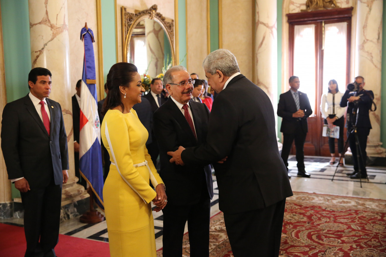 De manera entusiasta y con evidente alegría, el presidente Danilo Medina y la primera dama de la República, Cándida Montilla de Medina, recibieron los saludos de Año Nuevo, en una ceremonia que tuvo lugar en el Salón de Embajadores del Palacio Nacional.
