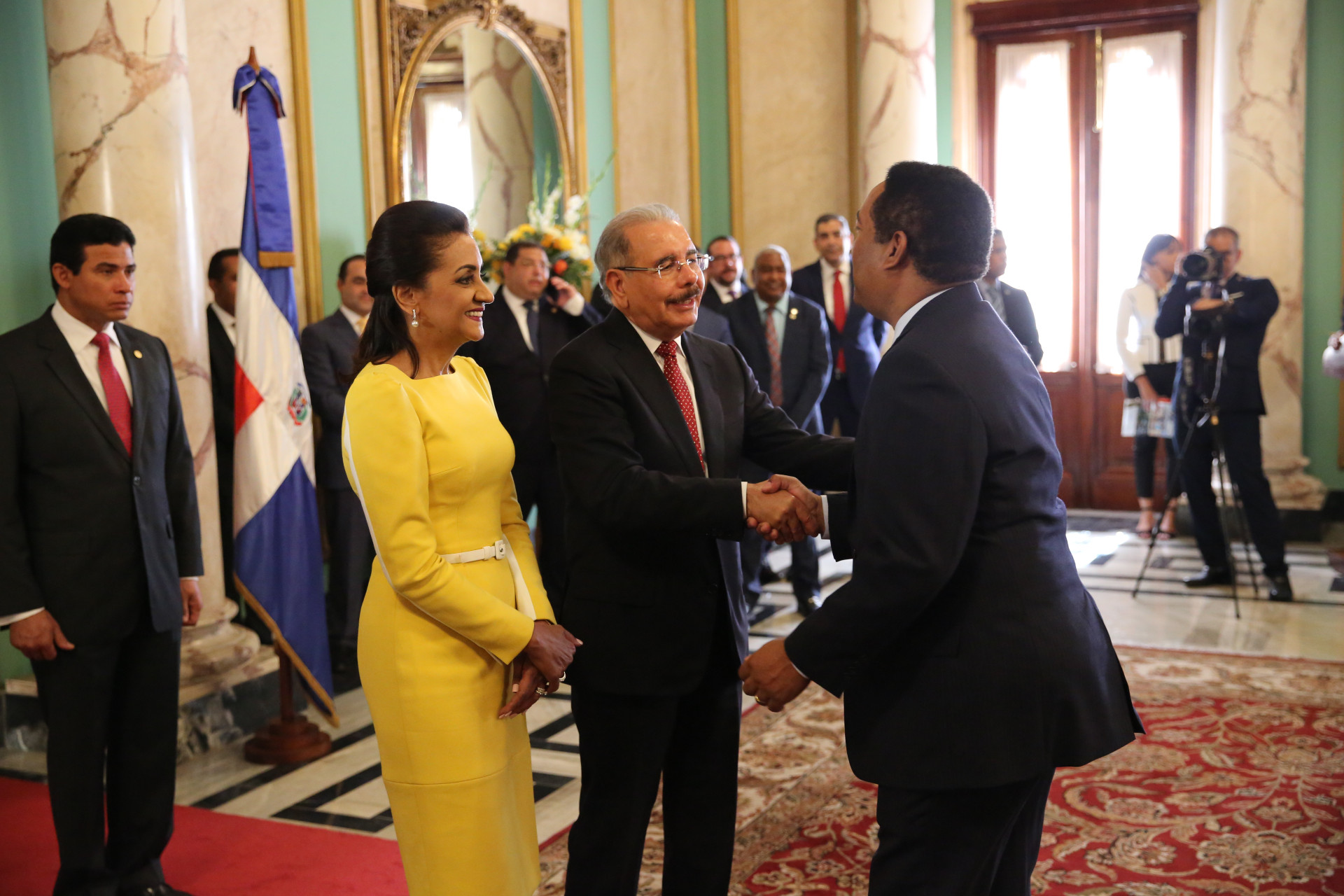 De manera entusiasta y con evidente alegría, el presidente Danilo Medina y la primera dama de la República, Cándida Montilla de Medina, recibieron los saludos de Año Nuevo, en una ceremonia que tuvo lugar en el Salón de Embajadores del Palacio Nacional.