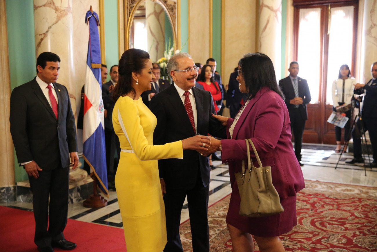 De manera entusiasta y con evidente alegría, el presidente Danilo Medina y la primera dama de la República, Cándida Montilla de Medina, recibieron los saludos de Año Nuevo, en una ceremonia que tuvo lugar en el Salón de Embajadores del Palacio Nacional.