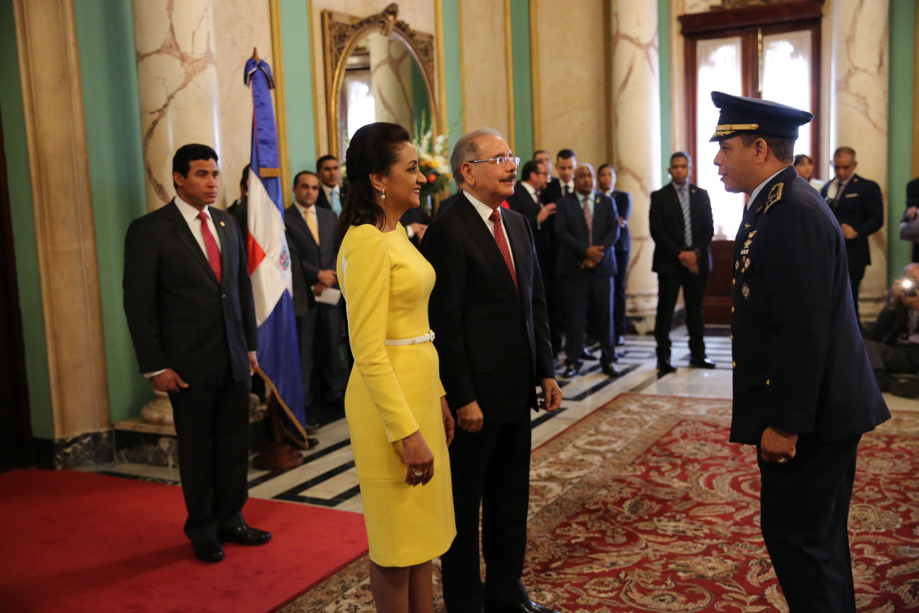 De manera entusiasta y con evidente alegría, el presidente Danilo Medina y la primera dama de la República, Cándida Montilla de Medina, recibieron los saludos de Año Nuevo, en una ceremonia que tuvo lugar en el Salón de Embajadores del Palacio Nacional.