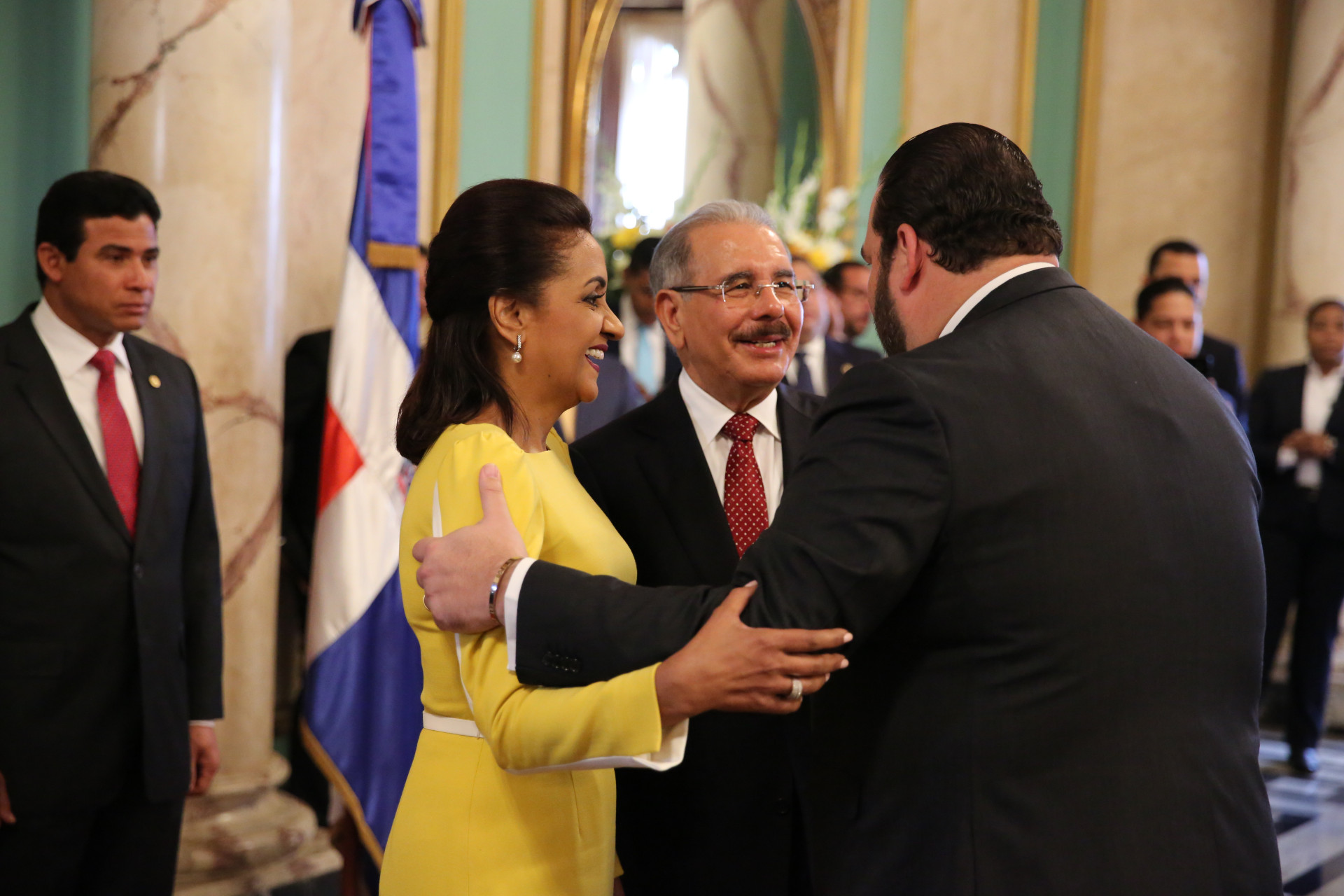 De manera entusiasta y con evidente alegría, el presidente Danilo Medina y la primera dama de la República, Cándida Montilla de Medina, recibieron los saludos de Año Nuevo, en una ceremonia que tuvo lugar en el Salón de Embajadores del Palacio Nacional.