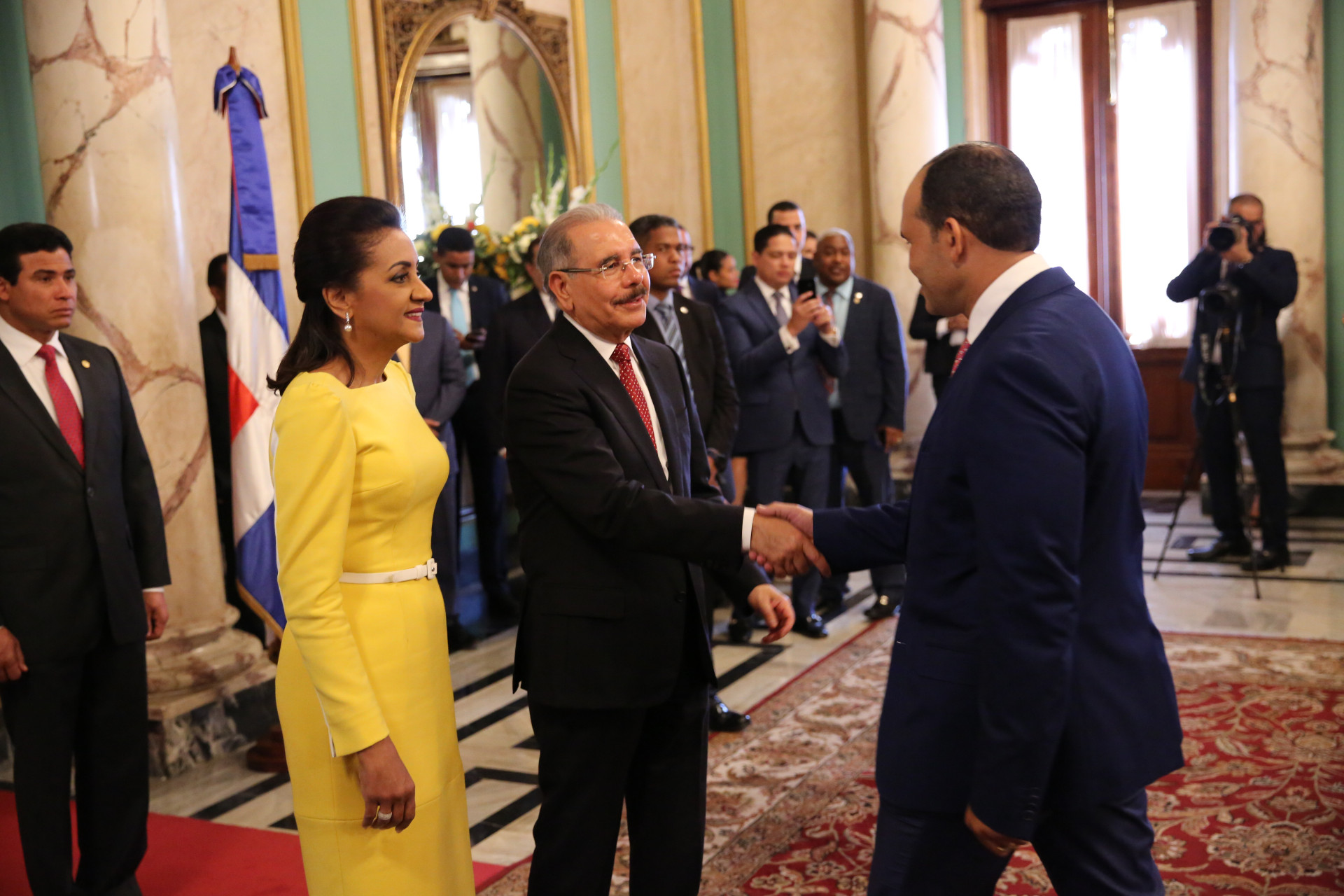 De manera entusiasta y con evidente alegría, el presidente Danilo Medina y la primera dama de la República, Cándida Montilla de Medina, recibieron los saludos de Año Nuevo, en una ceremonia que tuvo lugar en el Salón de Embajadores del Palacio Nacional.