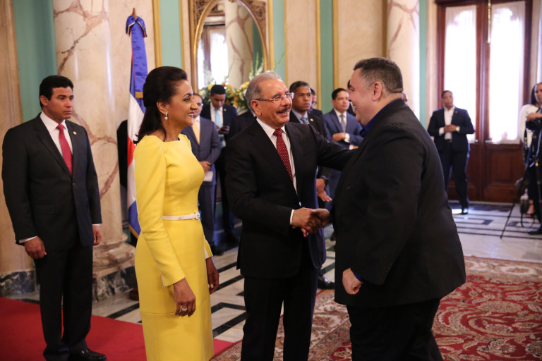 De manera entusiasta y con evidente alegría, el presidente Danilo Medina y la primera dama de la República, Cándida Montilla de Medina, recibieron los saludos de Año Nuevo, en una ceremonia que tuvo lugar en el Salón de Embajadores del Palacio Nacional.