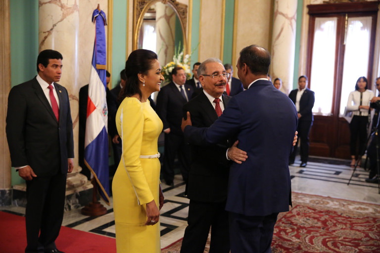 De manera entusiasta y con evidente alegría, el presidente Danilo Medina y la primera dama de la República, Cándida Montilla de Medina, recibieron los saludos de Año Nuevo, en una ceremonia que tuvo lugar en el Salón de Embajadores del Palacio Nacional.